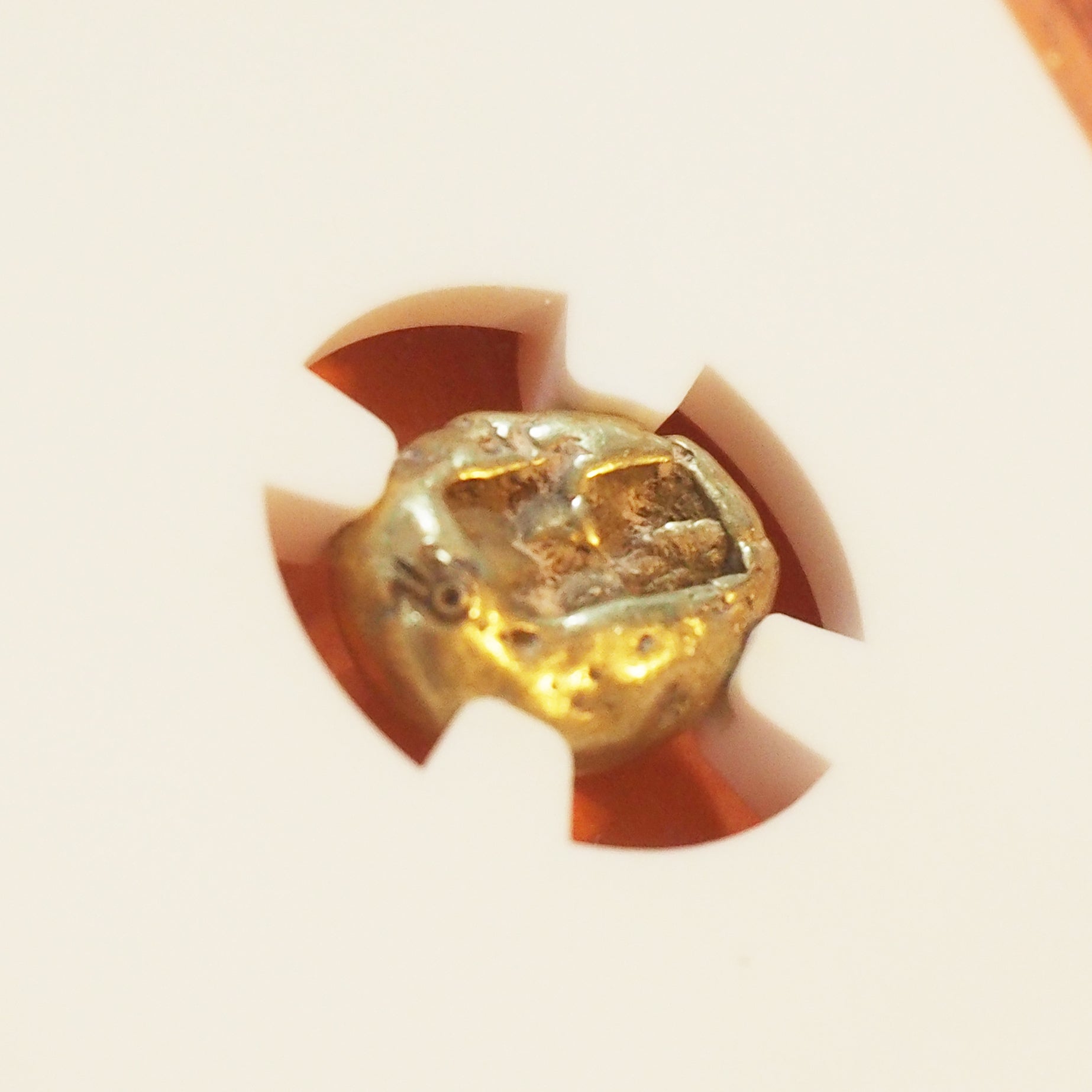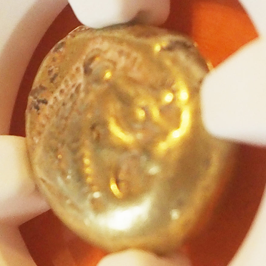 型を押し当て、台座部分である反面に凹んで打刻される、古代金貨に見られる製造方法なのですが、なんと、偽造防止目的とのデータもあり、当時の技術を考えると、「この時代でもズルする奴等がいたのか!?」とワクワクさえします。